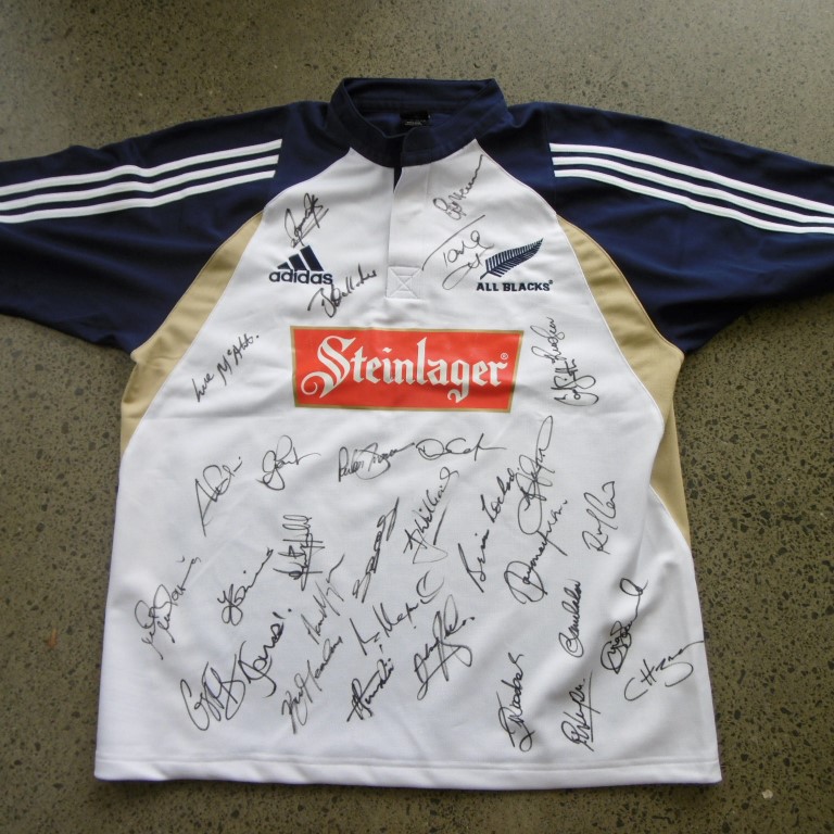 | Description | 2004 All Black End of Year Tour to the UK Training Jersey Signed by 31 players plus Sir Brian Lochore (mgr). Signatures include some great All Blacks including Doug Howlett, Luke McAlister, Byron Kelleher, Anton Oliver, Gark Jack, Reuben Thorne, Dan Carter, Tana Umaga (Cpt), Conrad Smith, Norm Maxwell, Rico Gear, Aaron Mauger, Mils Muliania, Kevin Mealamu, Jimmy Cowan, Cory Flynn, Jerome Kaino, Martin Holah, Steven Bates, Ali Williams, Joe Rokocoko, Tony Woodcock, Piri Weepu, Casey Laulala, Richie McCaw, Carl Hayman, Greg Sommerville, M Nonu, Jerry Collins & Sione Taumapeau. Adidas Brand Size XL |